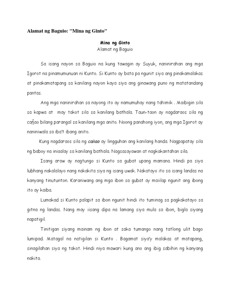 Mina ng Ginto Alamat ng Baguio 2014 1 June 1 2013 8 July 8 About Me. Ano ang wakas Ng salamat Ng mina Ng ginto sa Baguio. Ito ay mga kwentong bayan na karaniwang nagsasalaysay ng mga pangyayari sa tunay na mga tao o pook.